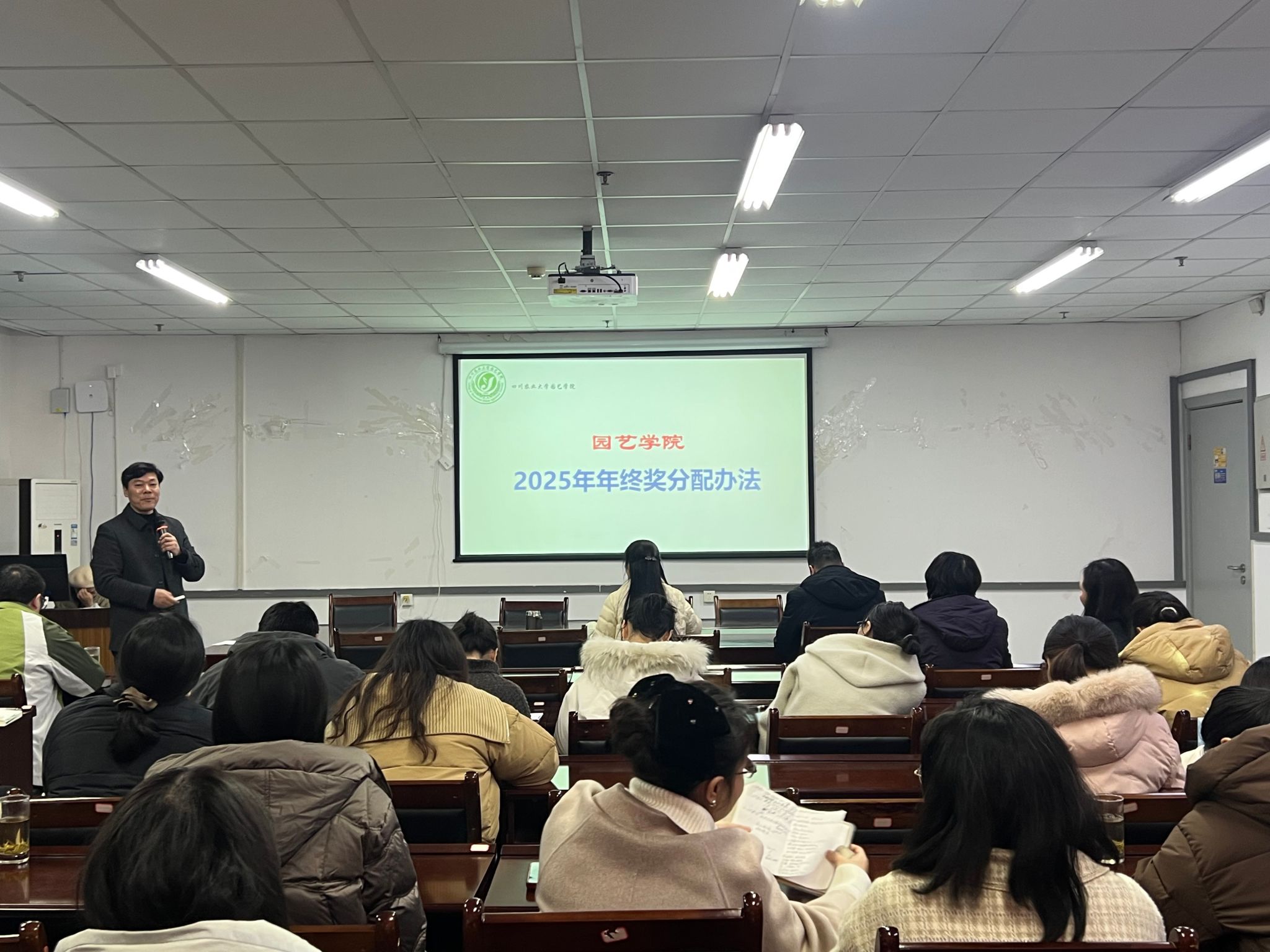 院长汪志辉全面回顾了本年度学院在学科专业、基金项目、社会服务、人才队伍等方面取得的主要成绩,同时冷静分析了当前面临的困难与挑战,特别强调了应以课程建设、拔尖人才培育、重大科研项目申报、高水平科研产出、科技和教学成果奖励申报等为重点抓手,鼓励每位教职工在个人赛道上明晰学校学院建设的重点,精准发力,以高度的责任感和时不我待的使命感,投身到学院“十五五”建设的实践中,用实际行动和优异成绩交出学院内涵式发展和学生成长成才的满意答卷。会上,汪志辉对年终奖分配方案和教职工绩效激励办法进行详细解读。