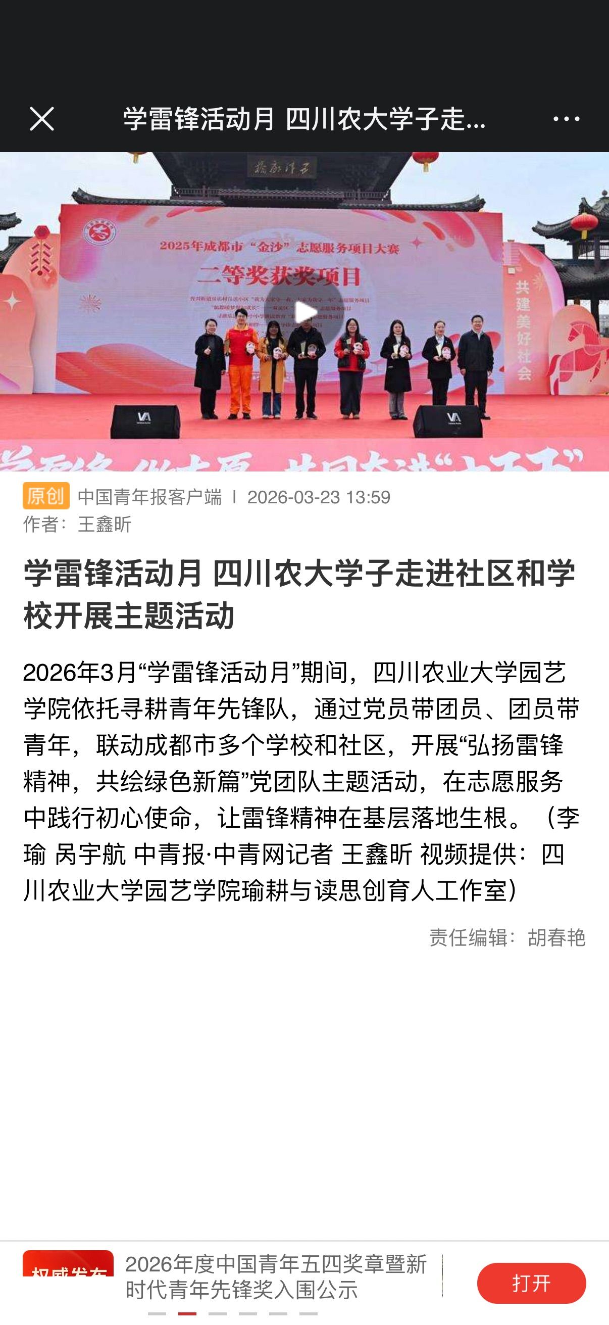 2026年3月“学雷锋活动月”期间,四川农业大学园艺学院依托寻耕青年先锋队,通过党员带团员、团员带青年,联动成都市多个学校和社区,开展“弘扬雷锋精神,共绘绿色新篇”党团队主题活动,在志愿服务中践行初心使命,让雷锋精神在基层落地生根。(李瑜 呙宇航 中青报·中青网记者 王鑫昕 视频提供:四川农业大学园艺学院瑜耕与读思创育人工作室)
