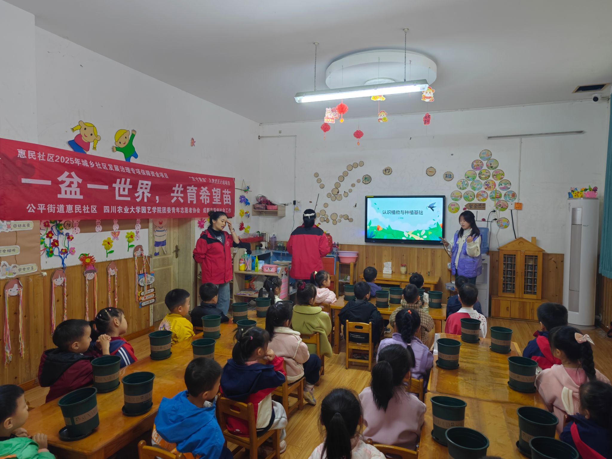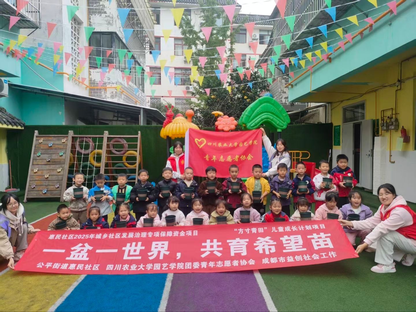 2025年11月5日,学院团委青年志愿者协会在温江区惠民社区华林幼儿园举办了“一盆一世界,共育希望苗”志愿活动,为社区幼儿园的小朋友们带来了一场生动有趣的盆栽种植劳动教育活动。此次活动旨在通过种植体验培养小朋友的劳动习惯和科学兴趣。